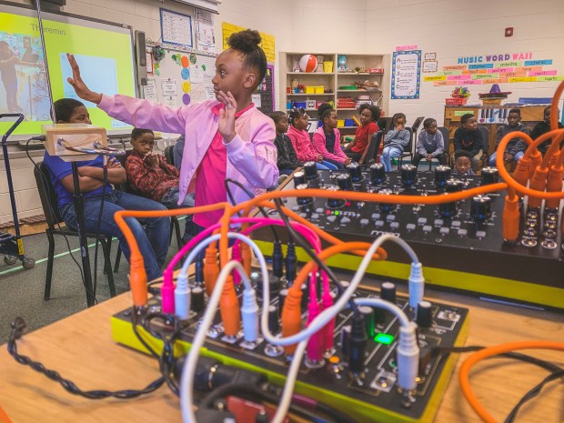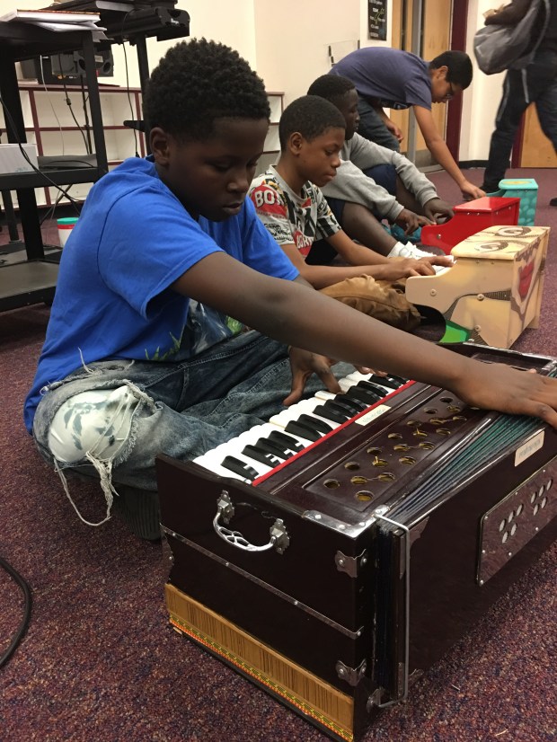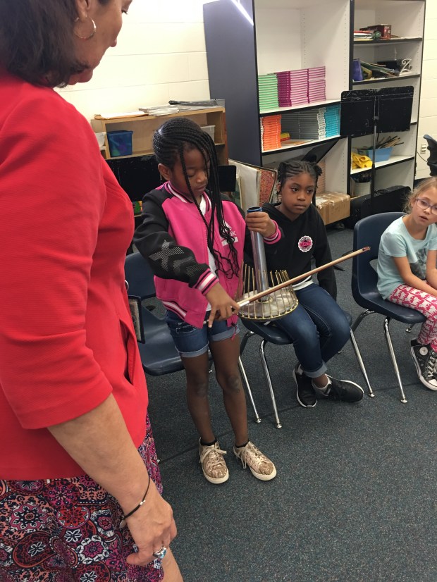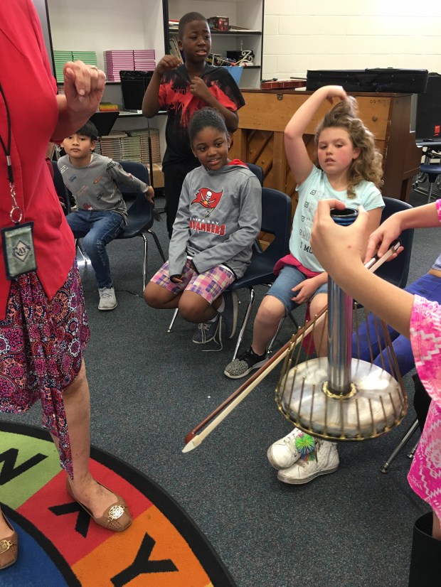 Elementary student bows a waterphone in front of classmates.