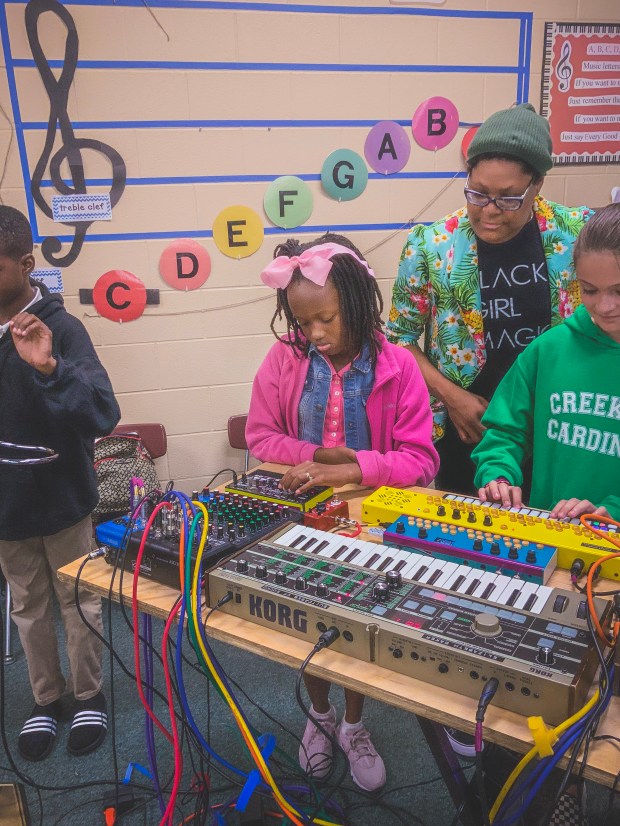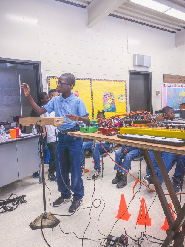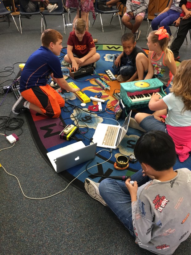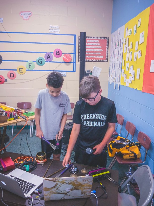 Students working together to create a cohesive improvised piece using electronics and toy piano.