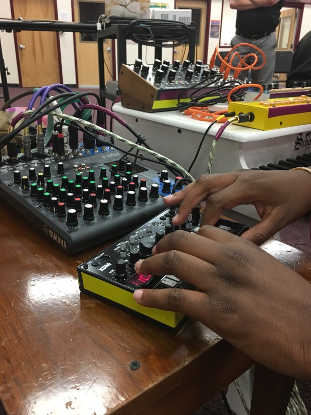 Young student wielding The Ring of Power, also known as a Source Audio Hot Hand Wireless MIDI Controller.
