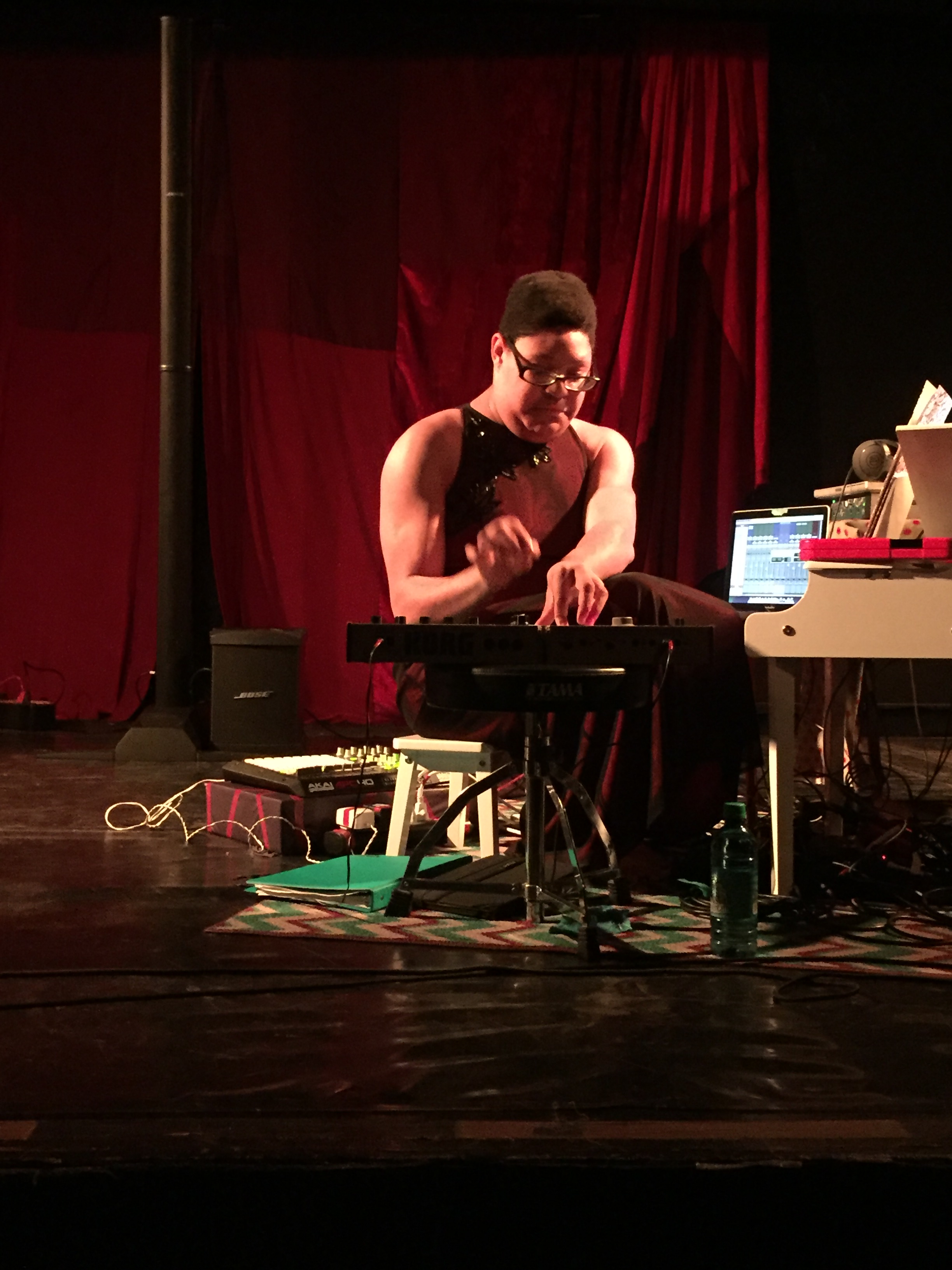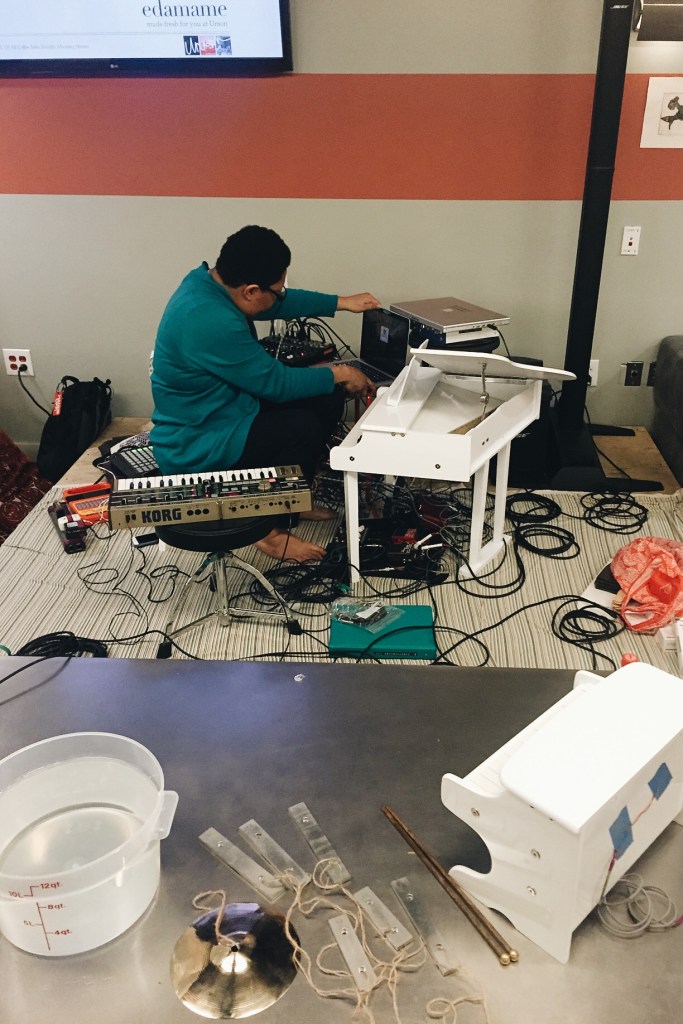 In addition to electronic and acoustic components, the body of the performer is also a crucial element of the system, whether used as a active choreographic being or a passive conduit for engaging with other parts of the system.